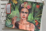 Frida Kahlo smoking wearing flowers and surrounded by parrots! Canvas clutch bag with hand strap and clip on shoulder strap. 10 x 11.5" and with interior pocket and zip. Green, red, pink & blue.