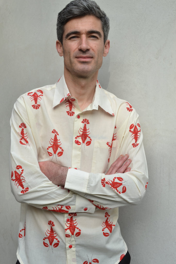 A cream light cotton fabric with red lobsters, red & white buttons & long sleeves.