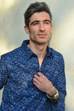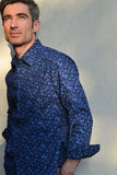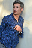 A luxurious double sided fabric long sleeved shirt with electric blue pattern on navy fabric.