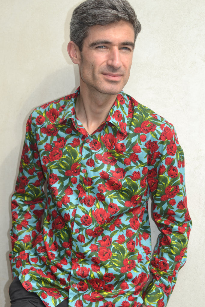 A stunning floral shirt in light blue cotton with red, green & yellow print. Red buttons and long sleeves.