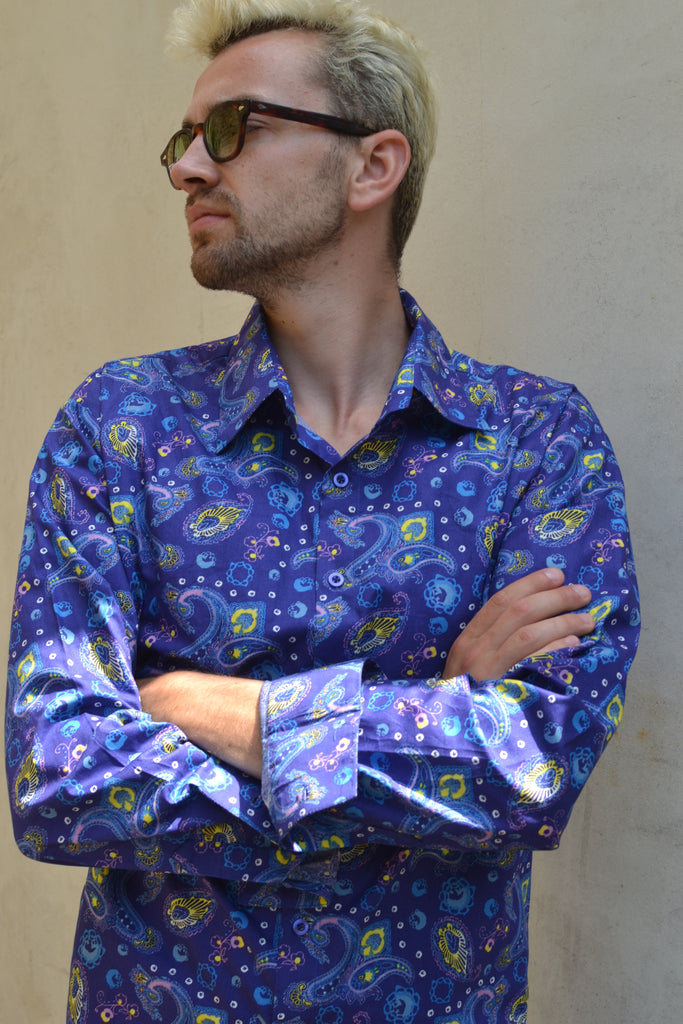 A stunning paisley printed yellow & purple long sleeved, cotton shirt.one only.