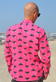 A really fun pink cotton fabric shirt with black pussycat's & white whiskers! In long sleeves and with black lucky buttons.