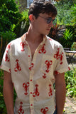 A red lobster shirt on a cream coloured light cotton fabric with short sleeves and red & white buttons.