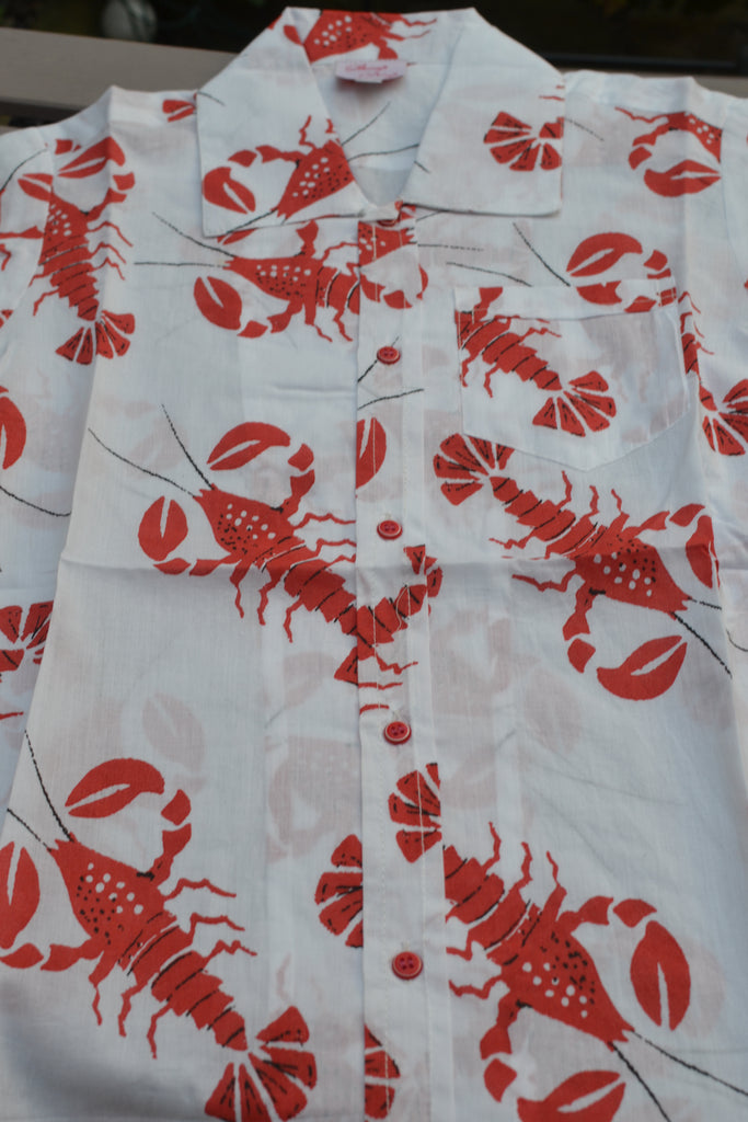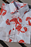 kids short sleeve summer rock lobster shirt. A fun lobster print with red & white buttons and a pocket which kids love.