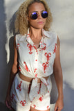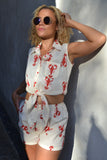 A cream cotton sleeveless tie top with red lobsters & red and white buttons. These are super cool for summer or as pj's for lounging at home. We also have matching shorts.